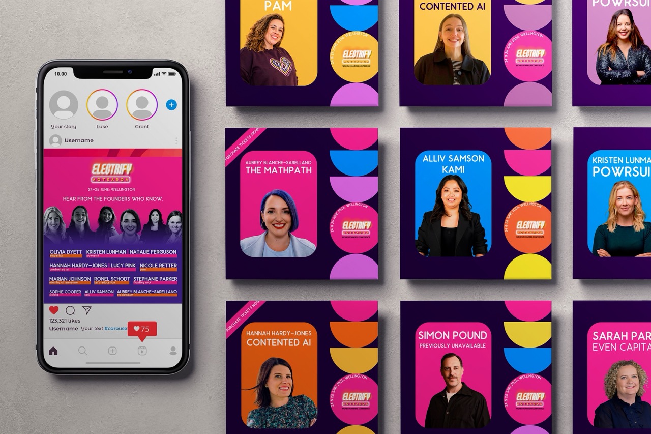 Electrify Aotearoa is NZs biggest women founder conference, designed to accelerate the visibility, leadership, and success of women founders in New Zealand. With creative production spanning several months and multiple contributors, a key challenge was maintaining cohesion across a rapidly growing volume of event assets, from digital promotions to venue branding, speaker collateral, merchandise, and presentation content. Consistency of message and design direction had to be carefully stewarded so that the creative vision set in month one was still executed accurately and powerfully in month six.